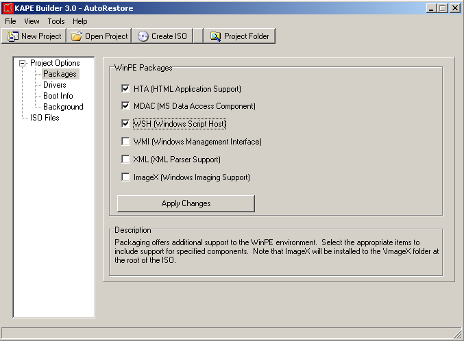 KAPE provides for the creation of a new WinPE project, enables automatic mounting/unmounting of .wim files, and includes functionality such as injecting Windows drivers and modifying the installed WinPE packages. Please see the reference tab for details.