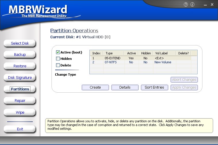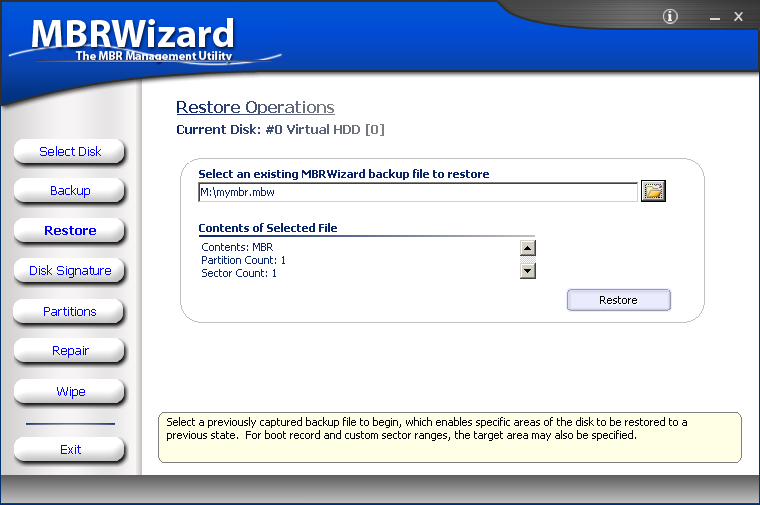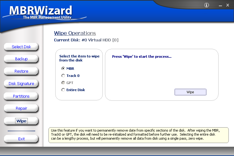 MBRWizard offers a simple, user-friendly graphical interface version for our flagship product. With simple point-and-click navigation, an easy-to-use feature set, and basic wizard driven operations, primary tasks become straightforward for even novice users, while still helping to prevent accidental changes. With MBRWizard 4.1, even novice users will be able to quickly backup, restore, and repair the MBR, as well as solve other MBR related issues.