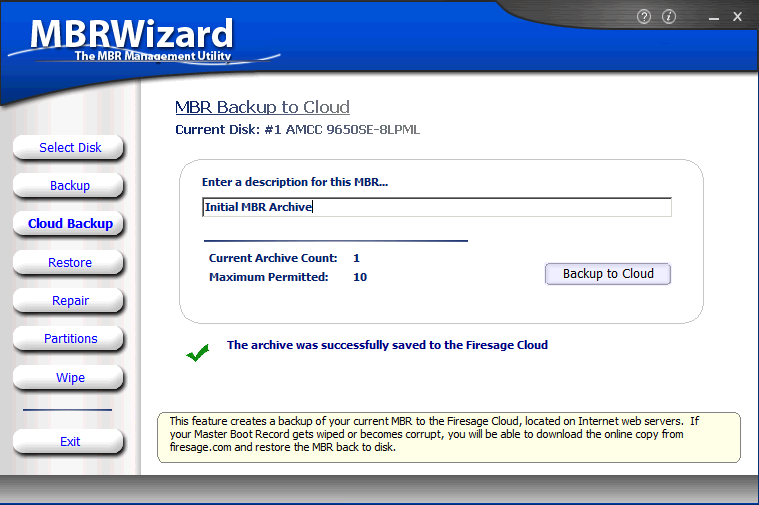 The release of MBRWizard 4.1 brings the ability to backup the MBR directly to the Firesage Cloud. No longer will you worry about misplacing your backup files, or stress about losing the USB drive or other media on which they are stored. Simply select Cloud Backup inside MBRWizard, and your MBR data will be securely stored on our servers... safely away from any disaster than may happen in your environment.